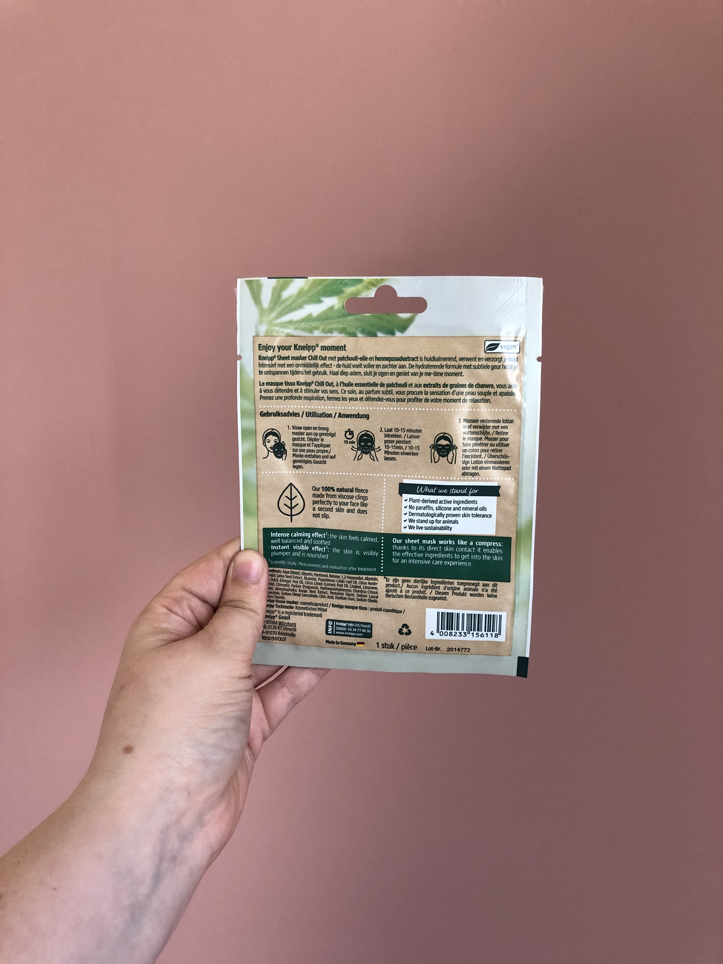 Het Chill Out Sheet Mask van Kneipp is verrijkt met patchouli-olie en hennepzaadextract. Dit masker zou de huid kalmeren, verwennen en intensief verzorgen. Zo zou het masker de huid voller en zachter aanvoelen door de verzorgende formule. Het zou een ontspannend effect hebben. Dit masker is volledig veganistisch. Je kan het Chill Out Mask van Kneipp hier op bol.com terugvinden.